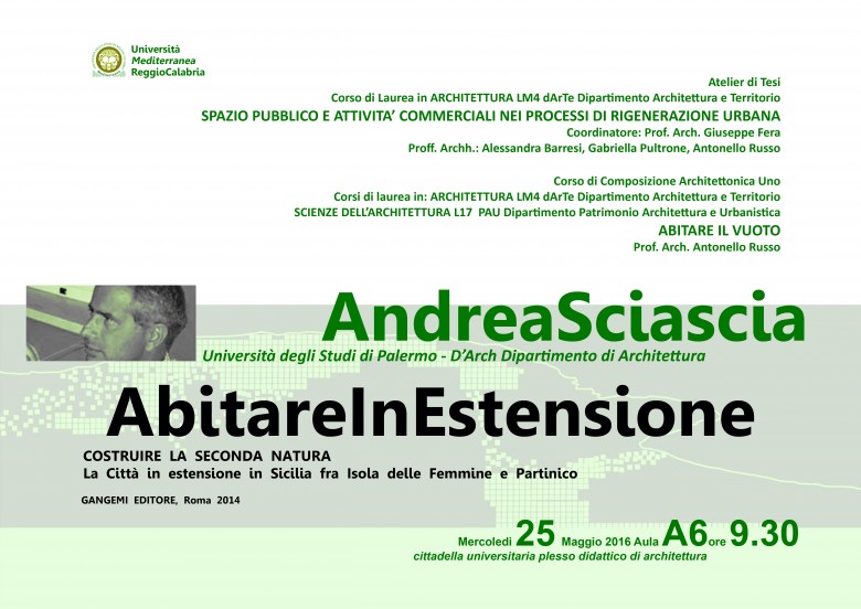 Mercoledì 25 maggio, a partire dalle ore 9.30 in aula A6 del plesso di architettura, Andrea Sciascia, ordinario di progettazione architettonica e direttore del dipartimento di Architettura dell’Università degli Studi di Palermo, presenterà il volume Costruire la seconda natura edito da Gangemi Editore, Roma nel 2014.