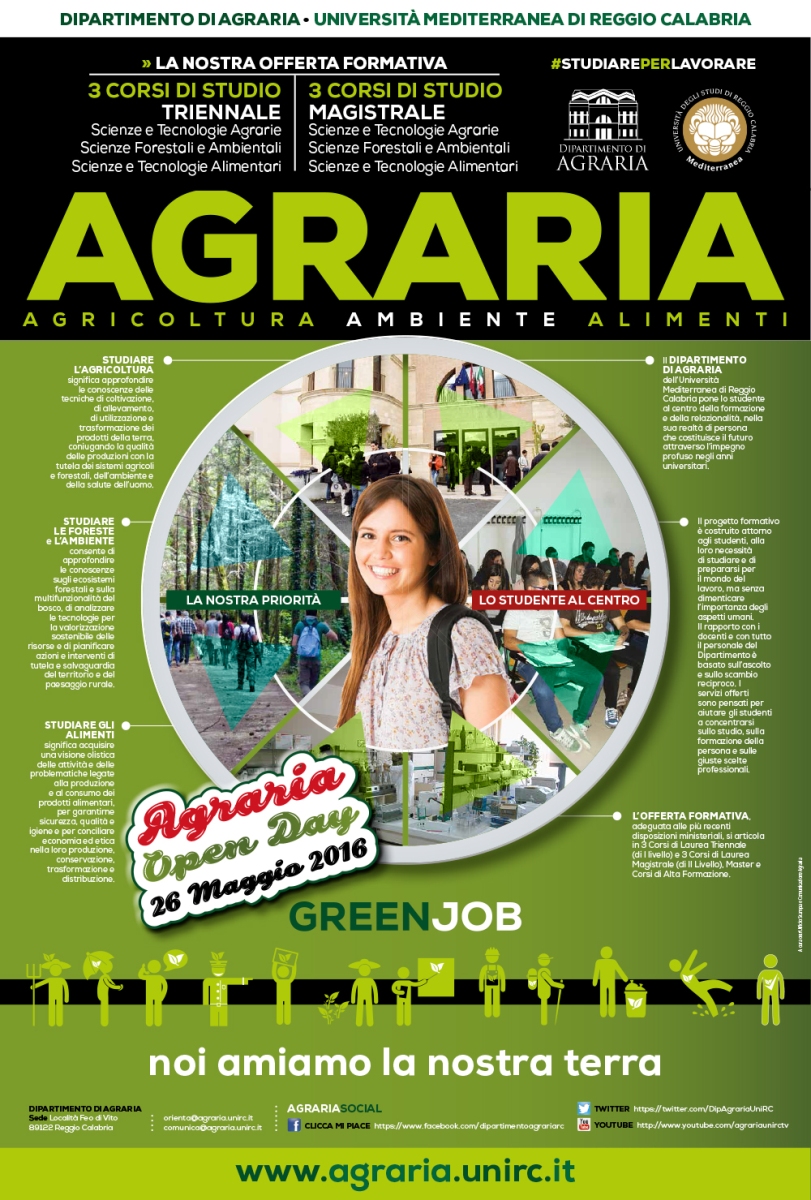 Giovedì 26 maggio dalle ore 9.00 alle ore 13.00 il Dipartimento di Agraria dell’Università Mediterranea di Reggio Calabria si aprirà al pubblico - e in particolare agli studenti delle classi quarte e quinte degli istituti superiori - per presentare l’offerta didattica e l’attività scientifica.