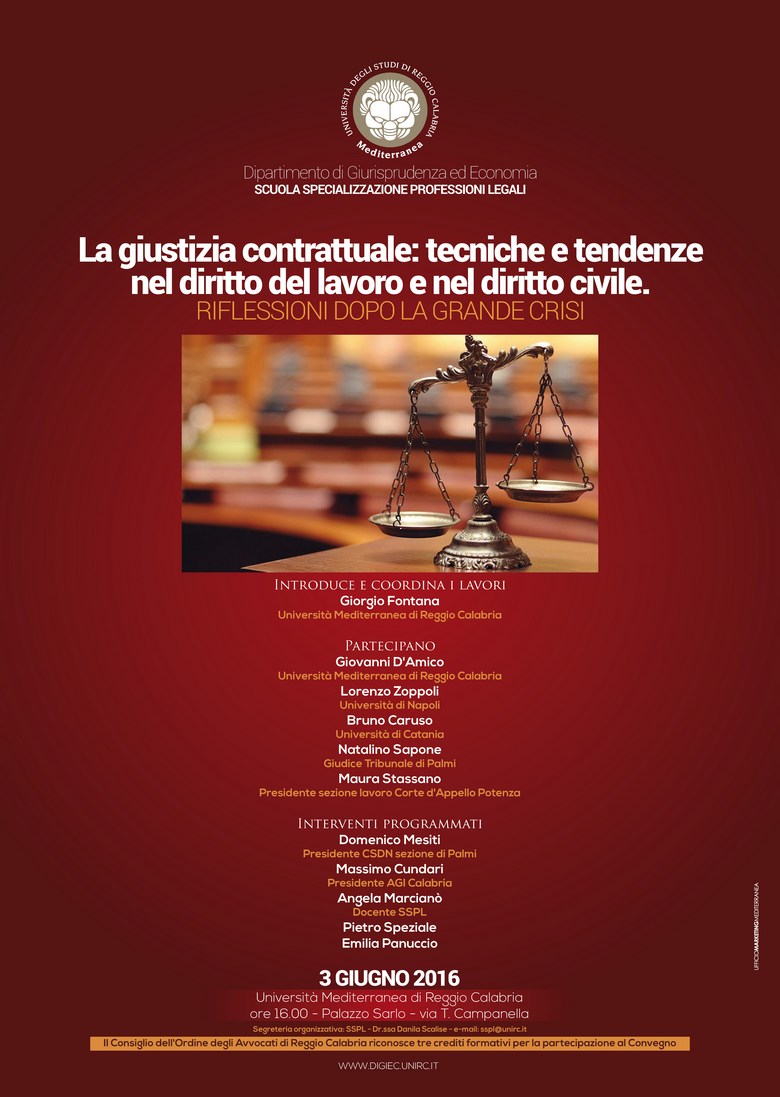 Su questi temi la discussione organizzata per venerdì 3 giugno a palazzo Sarlo, dalle ore 16, vedrà un confronto fra gius-civilisti e gius-lavoristi, con la partecipazione di studiosi che hanno offerto un contributo critico originale a questa riflessione, come il prof. Bruno Caruso dell'Università di Catania e il prof. Lorenzo Zoppoli dell'Università di Napoli, di magistrati e docenti dell'Università Mediterranea.