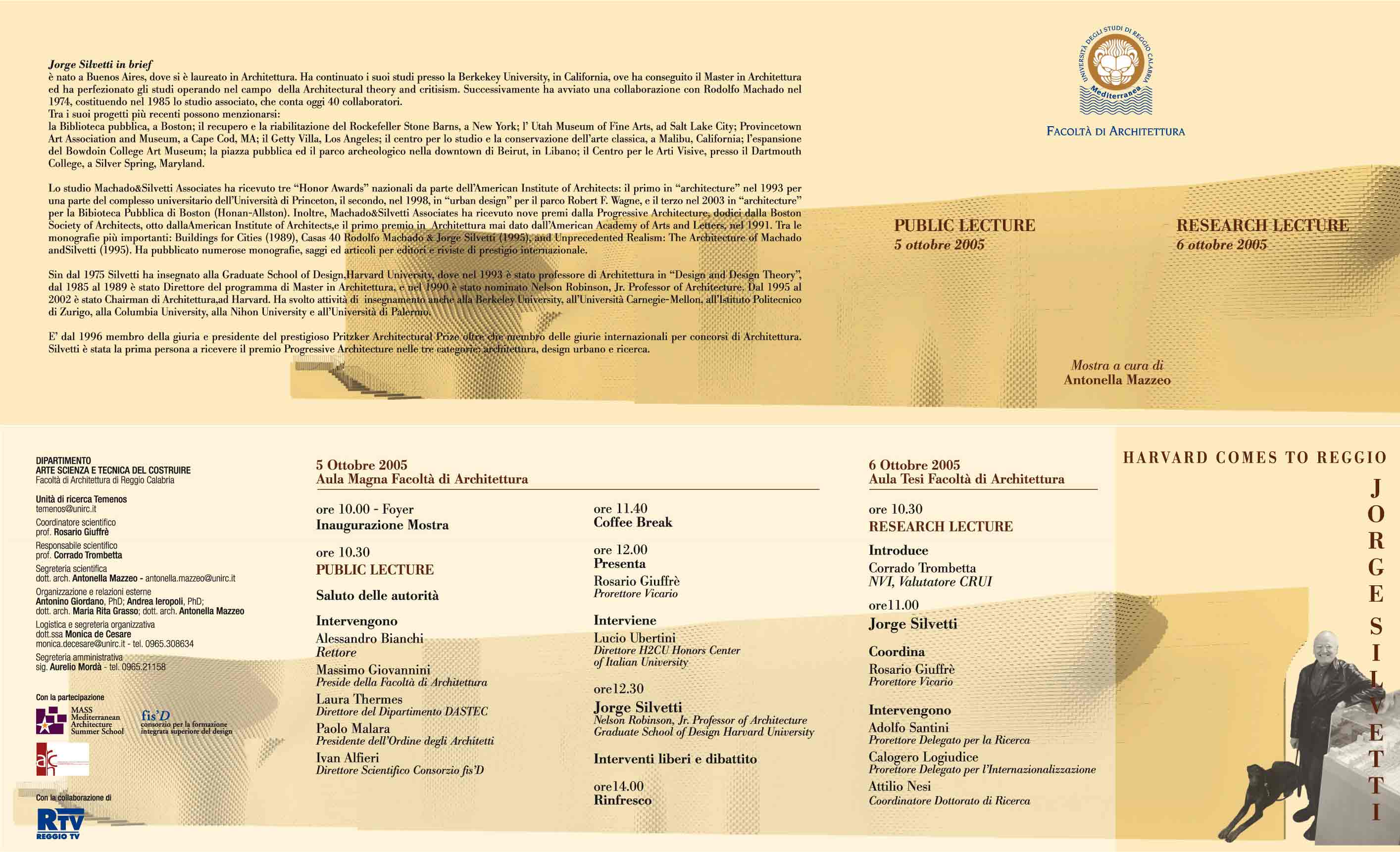 L’Università Mediterranea ospiterà Jorge Silvetti, architetto di fama internazionale, già Dean della Faculty of Architecture – Harvard University, nell’ambito della manifestazione Harvard comes to Reggio, promossa e coordinata dal prof. Rosario Giuffrè, Prorettore vicario. Presso la Facoltà di Architettura verrà allestita una mostra dedicata alla sua attività professionale ed accademica, curata dall’arch. Antonella Mazzeo. Nell’ambito della manifestazione, Jorge Silvetti terrà una Public Lecture destinata alla comunità universitaria, ed una Research Lecture destinata ai Dottorati di Ricerca, con la partecipazione dei Prorettori delegati per le relazioni internazionali e per la ricerca, e del prof. Lucio Ubertini, direttore del Centro Interuniversitario H2CU, ai fini della promozione di un accordo di collaborazione internazionale con l’Harvard University. I dettagli della manifestazione nel file allegato