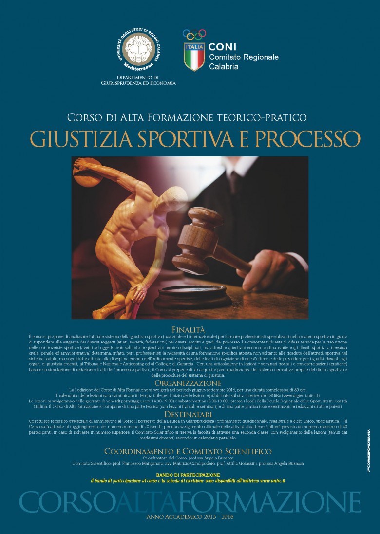 Il Dipartimento di Giurisprudenza ed Economia dell'Università Mediterranea di Reggio Calabria ed il CONI Comitato Regionale Calabria, organizzano nell'a. a. 2015/2016 la I edizione del Corso di Alta Formazione in “GIUSTIZIA SPORTIVA E PROCESSO”.
