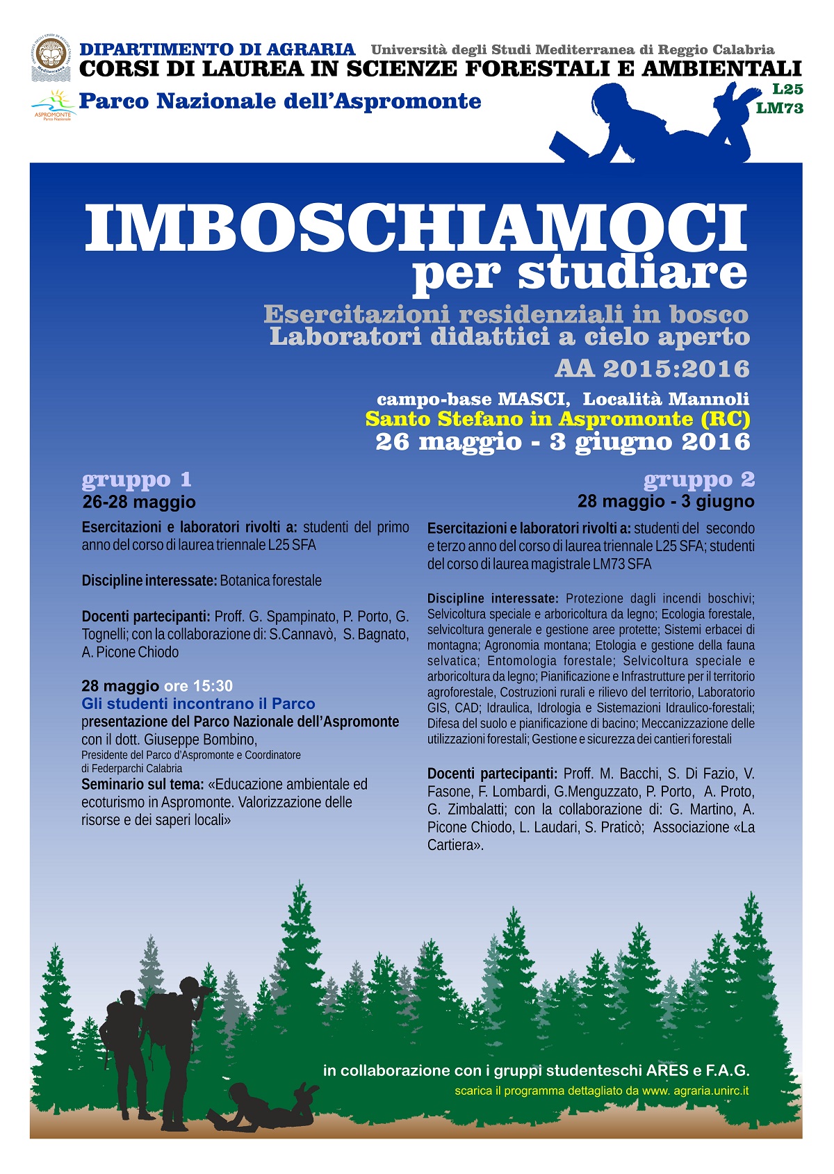 Si sono concluse le ormai consuete esercitazioni didattiche residenziali in bosco promosse dai Corsi di laurea L25 e LM73 in Scienze forestali e ambientali del Dipartimento di Agraria dell’Università Mediterranea di Reggio Calabria. “Imboschiamoci (per studiare!)” è il titolo dell’iniziativa che quest’anno, dal 26 maggio al 3 giugno, si è svolta nel Parco Nazionale dell’Aspromonte, avendo come base operativa il campo MASCI di Mannoli – S. Stefano in Aspromonte.
