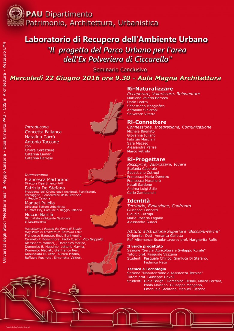 Mercoledì 22 giugno si svolgerà presso l’Aula magna di Architettura il seminario conclusivo: Il progetto del parco urbano per l’area della ex polveriera di Ciccarello, a conclusione del Laboratorio di Recupero dell’ambiente urbano dell’ultimo anno di corso della laurea magistrale in Architettura – Restauro, classe LM4, tenuto dai proff. Concetta Fallanca, Natalina Carrà e Antonio Taccone.