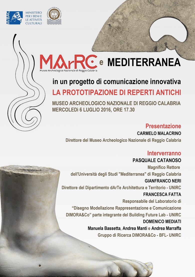 Il progetto presenta i primi prototipi effettuati per i programmi espositivi del MarRC, attuati grazie alle intese stabilite tra il Direttore del Museo, il Rettore della Mediterranea, Pasquale Catanoso, il Direttore del D’ARTE Gianfranco Neri, il Responsabile scientifico del BFL, Corrado Trombetta e il gruppo di lavoro DiMoRa coordinato da Francesca Fatta, e costituito da Domenico Mediati, Andrea Manti, Manuela Bassetta e Andrea Marraffa.