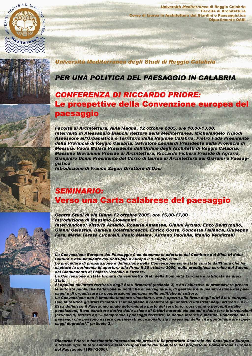 I due momenti della giornata: - Conferenza di Riccardo Priore Le prospettive della Convenzione europea del paesaggio Aula MagnaFacoltà di Architettura ore 10,00-13,00 - Seminario Verso una Carta calabrese del paesaggio Centro Studi di via Diana ore 15,00-17,00