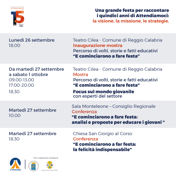 Dal 27 all’1 ottobre ogni giorno dalle 9 alle 13 e dalle 17 alle 20 presso l’androne del Teatro Comunale vi sarà l’evento “E cominciarono a far festa” che presenterà una lettura dei bisogni dei giovani e un tentativo di risposta attraverso idee e azioni concrete (link: https://www.facebook.com/notes/attendiamoci-onlus/e-cominciarono-a-fare-festa-programma-eventi/10154090865544032).