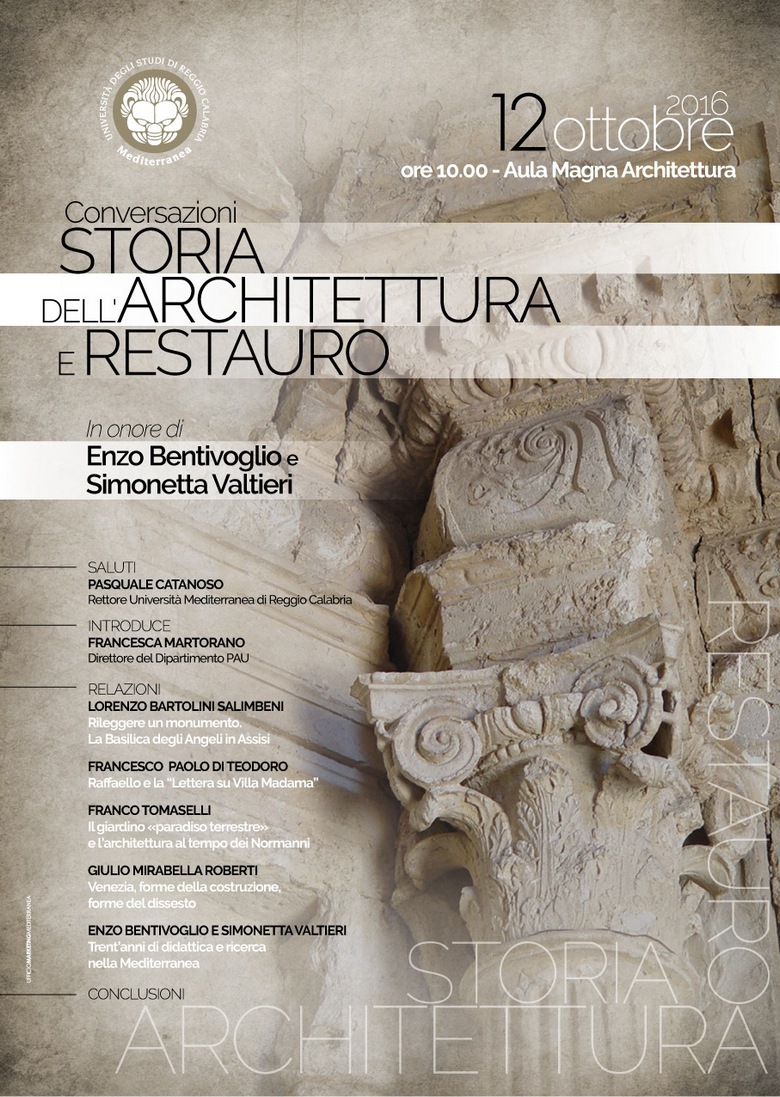 Mercoledì 12 ottobre, in Aula magna d'Architettura, alle ore 10.00, l'Ateneo di Reggio Calabria ha salutato i decani delle discipline Storia dell’Architettura e Restauro proff. Enzo Bentivoglio e Simonetta Valtieri con un seminario in loro onore.