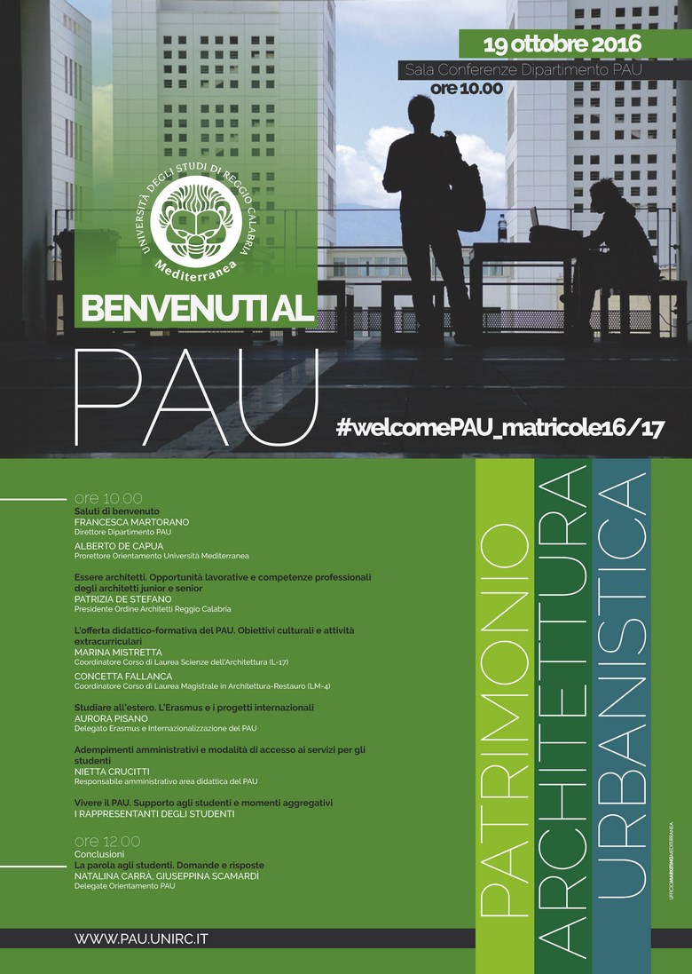 Il 19 ottobre 2016 alle ore 10.00, presso la Sala Conferenze, il Dipartimento PAU porgerà il benvenuto agli studenti del primo anno dei due Corsi di Laurea ad esso incardinati: il corso triennale in Scienze dell’Architettura (L-17) e il corso Magistrale in Architettura-Restauro (LM-4).