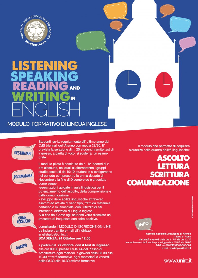 “LISTENING SPEAKING READING AND WRITING IN ENGLISH”, permette di acquisire sicurezza nelle quattro abilità linguistiche: ascolto, lettura, scrittura e comunicazione
