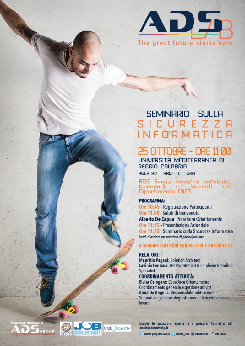 Il Centro Uni Orienta-Job Placement invita matricole, studenti laureandi e laureati del DIIES al seminario sulla sicurezza informatica a cura di ADS Group martedì 25 ottobre, ore 11.00 Aula 3 di Architettura.