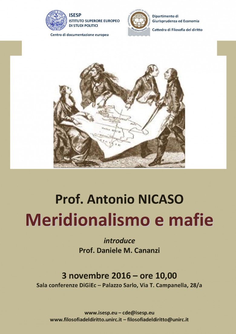 Il 3 novembre alle ore 10,00 presso la sala conferenze del DiGiEc (via T. Campanella), si terrà la lezione del prof. Antonio Nicaso dal titolo Meridionalismo e mafie.