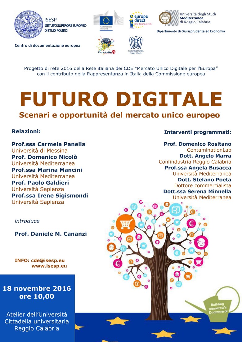 Il Centro di documentazione europea dell'ISESP e il Dipartimento di Giurisprudenza ed Economia dell'Università Mediterranea organizzano il Convegno "Futuro digitale. Scenari e opportunità del mercato unico europeo" che si terrà venerdì 18 novembre 2016 alle ore 10.00 presso l'Atelier di Architettura.