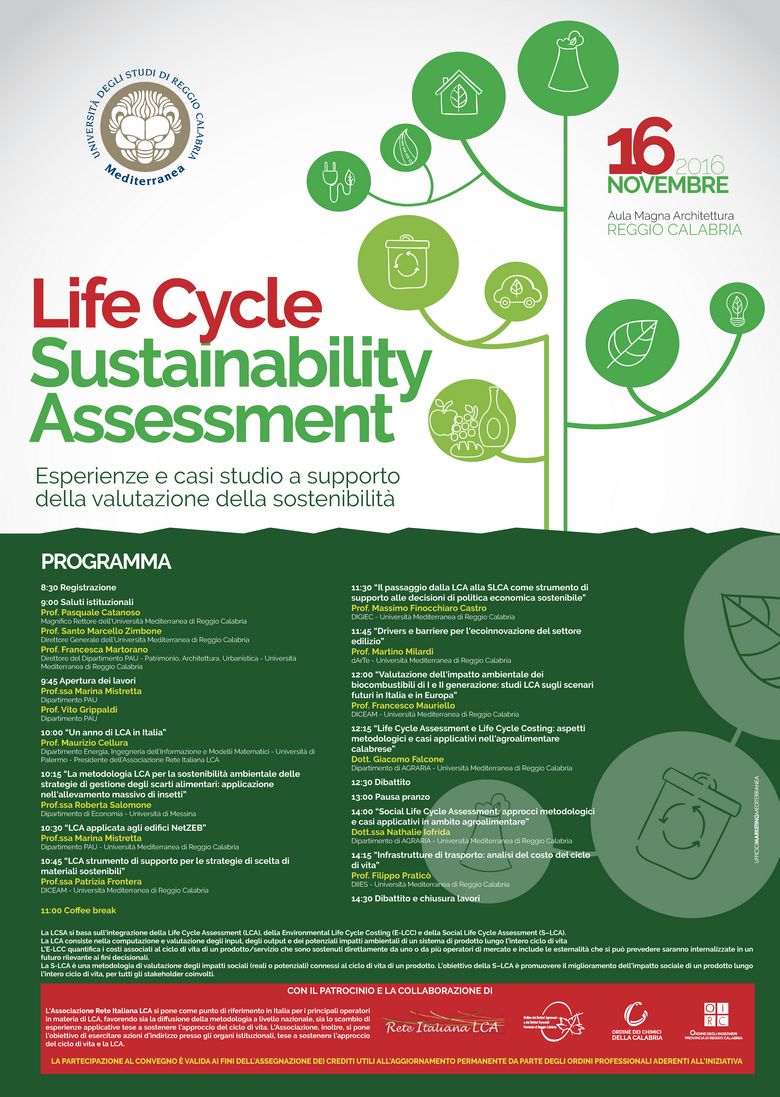 Il convegno è organizzato dal LCA Working Group interdipartimentale dell’Università di Reggio Calabria, costituito da professori e ricercatori impegnati da anni in attività di ricerca nel settore della LCA (Life Cycle Assessment) con il contributo dell’Ateneo, il patrocinio dell’Associazione Rete Italiana LCA e in collaborazione con gli ordini professionali degli agronomi, degli ingegneri e dei chimici di Reggio Calabria, con il rilascio di crediti formativi professionali per i partecipanti.