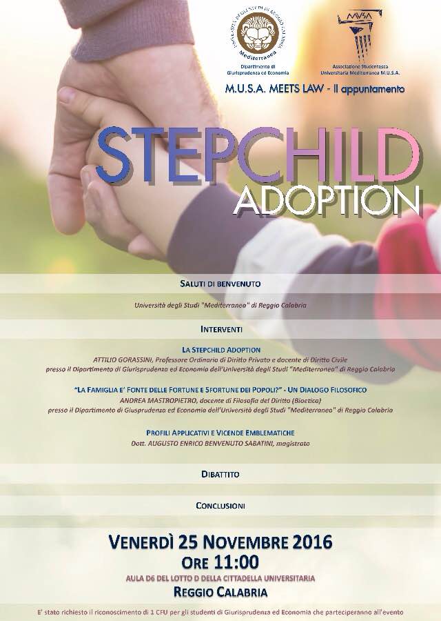 Venerdì 25 novembre, alle ore 11:00, presso l'aula D6 del Lotto D della nostra Università si terrà il convegno "Stepchild adoption", il II appuntamento targato Associazione M.U.S.A. del ciclo di attività "M.U.S.A. meets law".