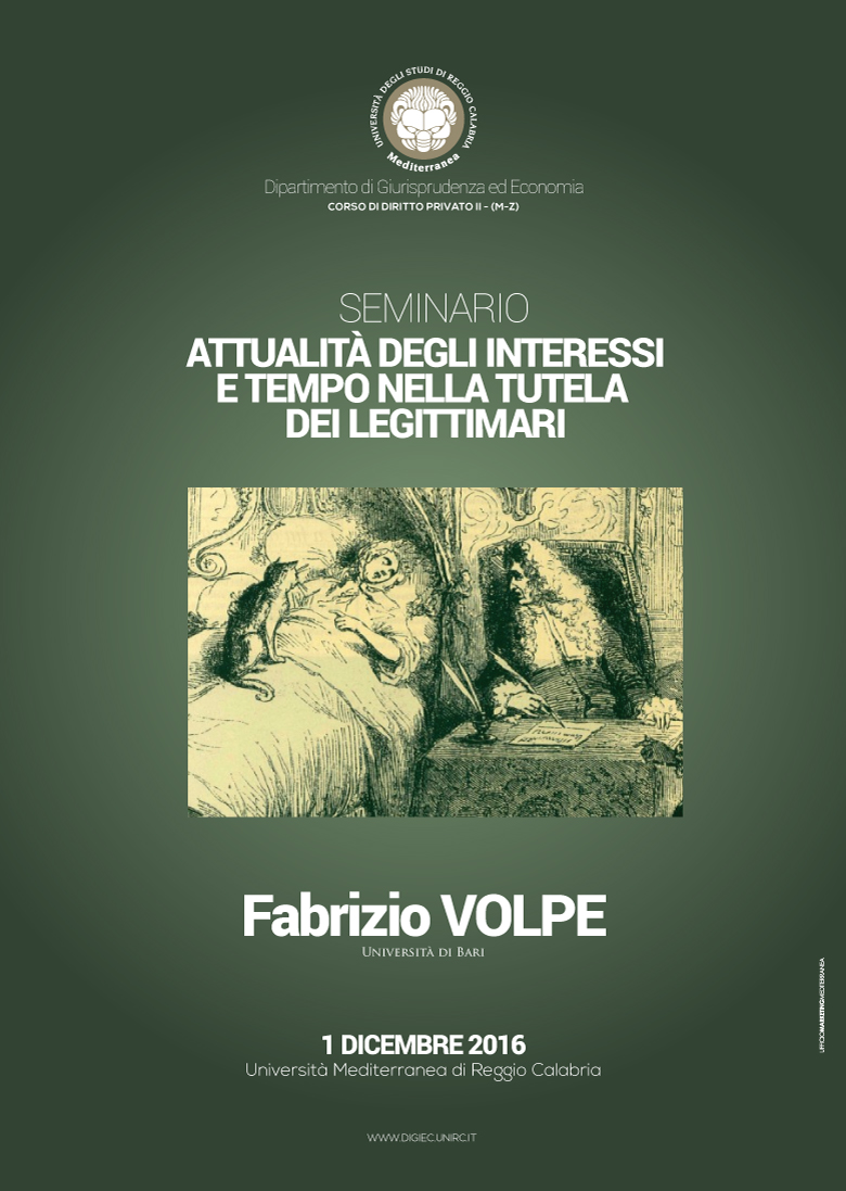 Giovedì I dicembre 2016, alle ore 11.00 in Aula D1, Lotto D - Cittadella Universitaria, il prof. Fabrizio Volpe dell'Università di Bari terrà un seminario, nell'ambito del Corso di Istituzioni di Diritto Privato II (canale M/Z), dal titolo "Attualità degli interessi e tempo nella tutela dei legittimari".