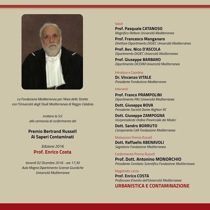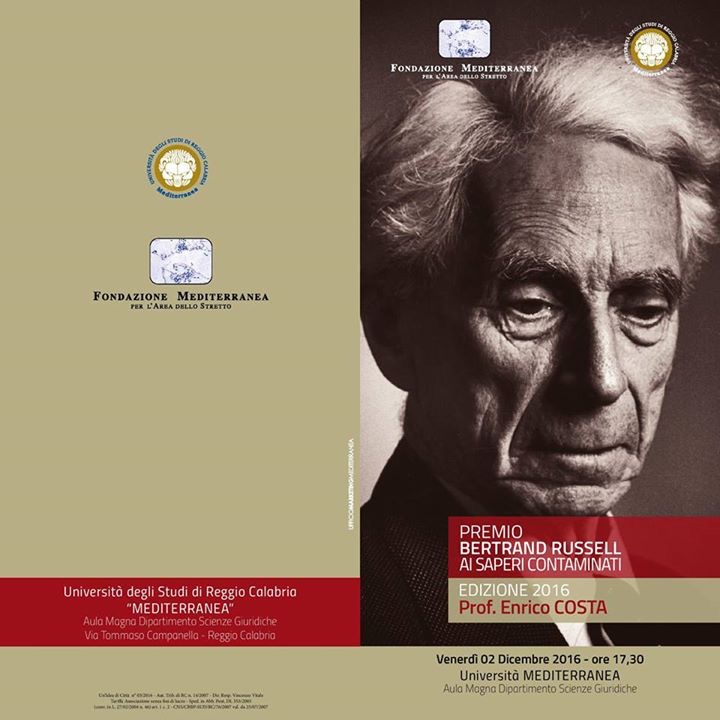 Il Premio Bertrand Russell ai saperi Contaminati Edizione 2016, attribuito annualmente dalla Fondazione Mediterranea in collaborazione con i dipartimenti di Ingegneria dell'Università Mediterranea, va al prof. emerito Enrico Costa.