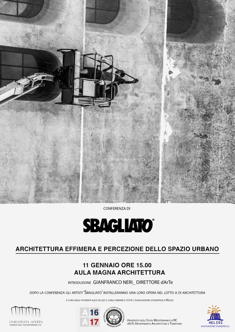 L'11 gennaio alle ore 15.00, presso l'Aula magna di Architettura, si terrà il seminario Sbagliato, Architettura Effimera e percezione dello spazio Urbano, organizzato dal gruppo studentesco Helios.
