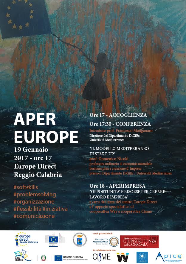 Lo Sportello Europe Direct di Reggio Calabria, nell’ambito delle iniziative promosse nel corso dell’anno 2017 in occasione dei 30 anni del programma Erasmus e dei 60 dalla firma del trattato di Roma, propone ai giovani della città e provincia di Reggio Calabria, gli Aper-Europe, un invito pomeridiano fatto di incontri ed eventi per discutere sul tema della mobilità in Europa, l’europrogettazione e il fare impresa. L'inziativa gode del patrocinio patrocinio del Dipartimento di Giurisprudenza ed Economia dell’Università Mediterranea di Reggio Calabria che sosterrà, mediante il contributo dei docenti del dipartimento, i vari seminari e le conferenze su cittadinanza europea, mobilità, auto imprenditorialità e cooperazione, attribuendo tra l’altro, crediti formativi agli studenti partecipanti.