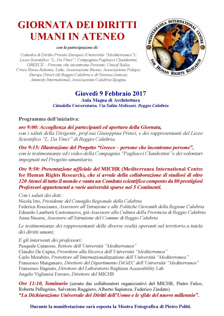 Giovedì 9 febbraio, a partire dalle ore 9:00, verranno formalmente avviate le attività del Centro, in Aula magna di Architettura, con una “Giornata sui diritti umani in Ateneo”, organizzata in collaborazione con la dirigente del Liceo Scientifico “L. Da Vinci”, prof.ssa Giuseppina Princi, e con le principali associazioni impegnate sul territorio in settori legati al tema della manifestazione: Unicef Italia; Croce Rossa Italiana; Lega italiana dei diritti umani; Biesse; Fidapa; Europe Direct (di Reggio Calabria e di Gioiosa Jonica); Amnesty International; Calabria-Spagna; Compagnia Pagliacci Clandestini; e GREECE – Persone che incontrano Persone. (i cui responsabili testimonieranno e illustreranno il Progetto umanitario con video e con la mostra fotografica di Pietro Politi).