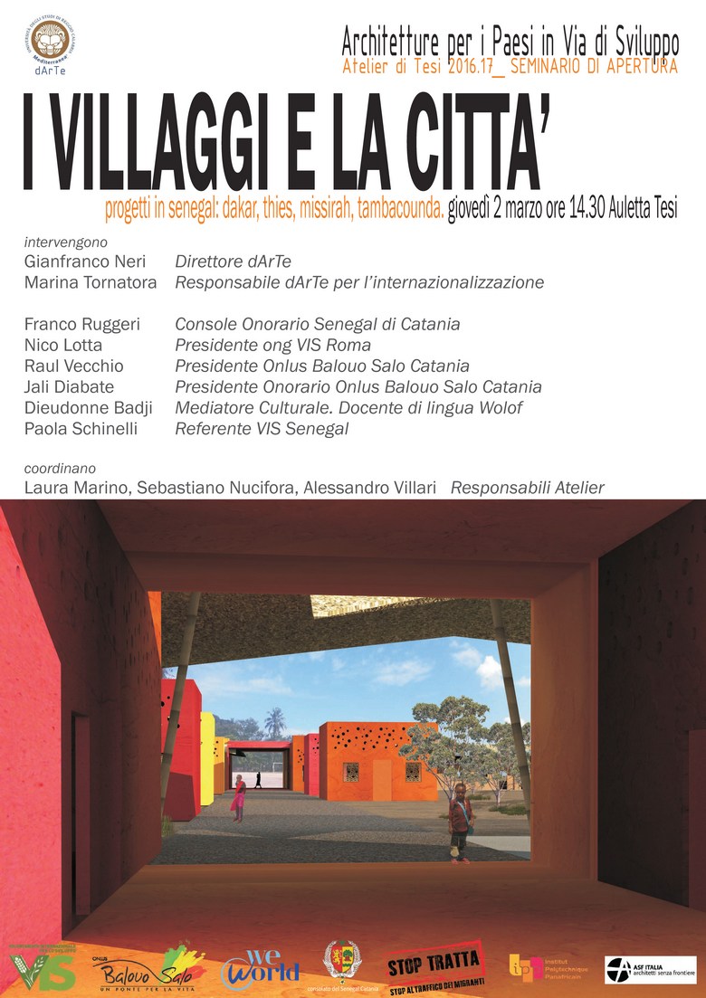 Giovedì 2 marzo alle ore 14.30, nell'Auletta Tesi del Dipartimento dArTe, avrà luogo il seminario introduttivo all'Atelier di Tesi “Architetture per i Paesi in Via di Sviluppo 2.0. Senegal: I villaggi e la città”.