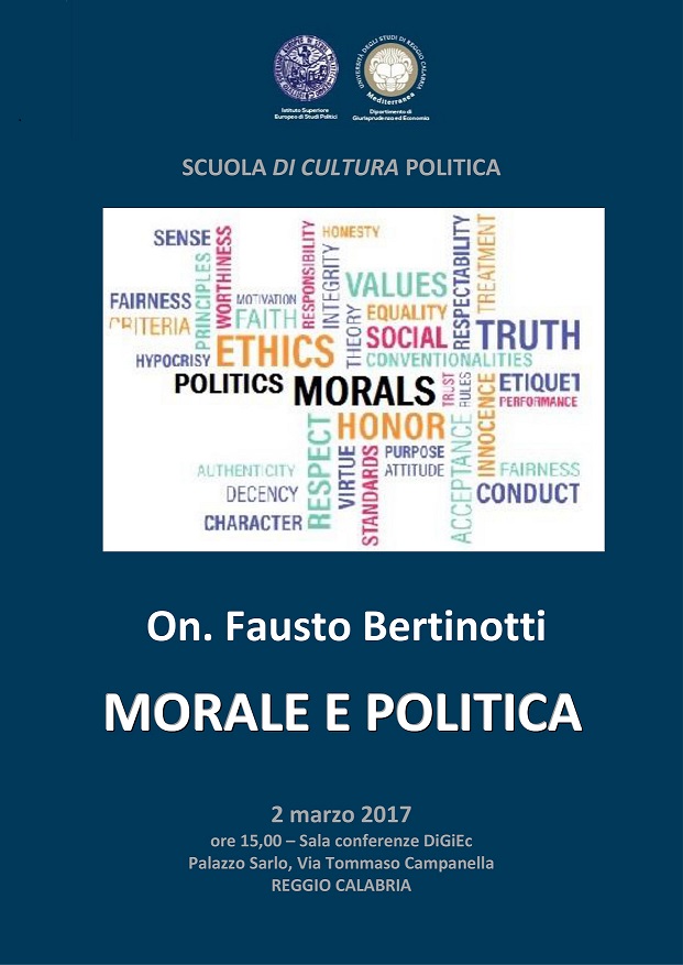 Il Corso 2016-2017 della Scuola di cultura politica prosegue con la conferenza dell'On. Fausto Bertinotti su 'Morale e politica' che si terrà giovedì 2 marzo 2017 alle ore 15,00 presso la sala conferenze del DiGiEc.
