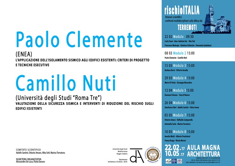 Il ciclo di seminari "Rischio Italia", organizzato dal Dipartimento DArTe del nostro Ateneo, si inquadra in questo contesto e vuole promuovere un dibattito multidisciplinare sul tema del rischio e della prevenzione. I seminari, rivolti a professionisti e studenti, saranno tenuti da alcuni tra i maggiori esperti italiani del settore e hanno lo scopo di contribuire a formare una consapevole e condivisa coscienza del pericolo e del conseguente rischio, mostrando che, pur nella loro ineluttabilità, dai terremoti ci si può e ci si deve difendere.