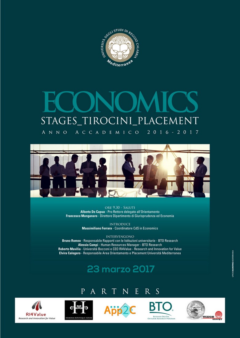 Giovedì 23 marzo, dalle ore 9.30 presso l’Aula magna di Architettura, saranno presentati i partners aziendali con cui il Dipartimento di Giurisprudenza ed Economia ha co-organizzato un fitto programma di stages e tirocini pre e post lauream tesi a realizzare un placement lavorativo per i primi laureati magistrali di economics che nei prossimi mesi cominceranno ad affacciarsi al job market.