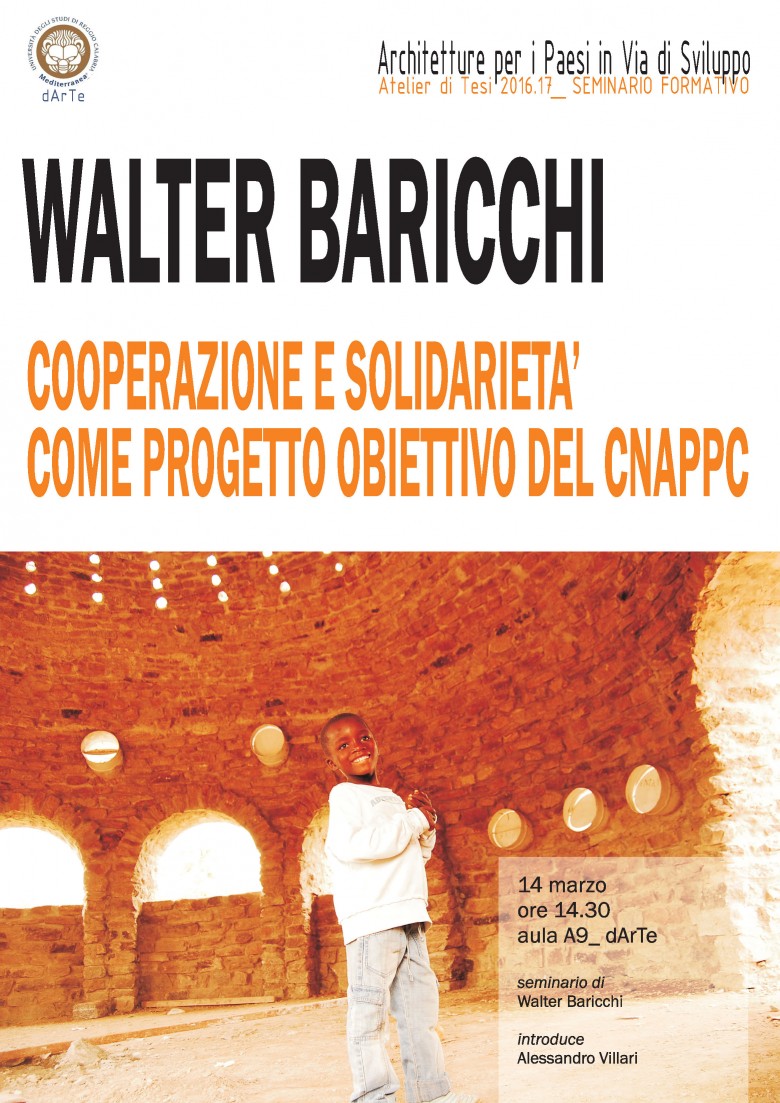 Nell’ambito delle attività dell’Atelier di Tesi “Architettura per i paesi in via di sviluppo”, attivato dal Dipartimento dArTe, il giorno 14.03.2017 alle ore 14,30 (aula A9) si svolgerà il seminario dell’arch. Walter Barichi dal titolo “COOPERAZIONE E SOLIDARIETÀ COME PROGETTO OBIETTIVO DEL CNAPPC”.