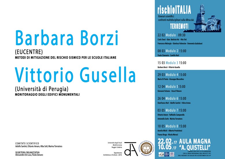 Il ciclo di seminari "Rischio Italia", organizzato dal Dipartimento DArTe del nostro Ateneo, si inquadra in questo contesto e vuole promuovere un dibattito multidisciplinare sul tema del rischio e della prevenzione. I seminari, rivolti a professionisti e studenti, saranno tenuti da alcuni tra i maggiori esperti italiani del settore e hanno lo scopo di contribuire a formare una consapevole e condivisa coscienza del pericolo e del conseguente rischio, mostrando che, pur nella loro ineluttabilità, dai terremoti ci si può e ci si deve difendere.