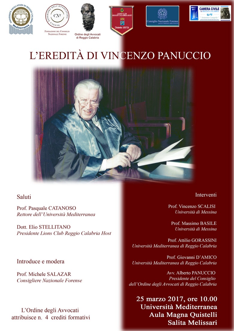 L’Università Mediterranea, il Consiglio nazionale Forense, l’Ordine degli avvocati, la Camera civile ed il Lions Club Host, vogliono ricordare l’eredità lasciata dal prof. Vincenzo Panuccio con un incontro in Aula Magna d'Ateneo, sabato 25 marzo dalle 10.00.