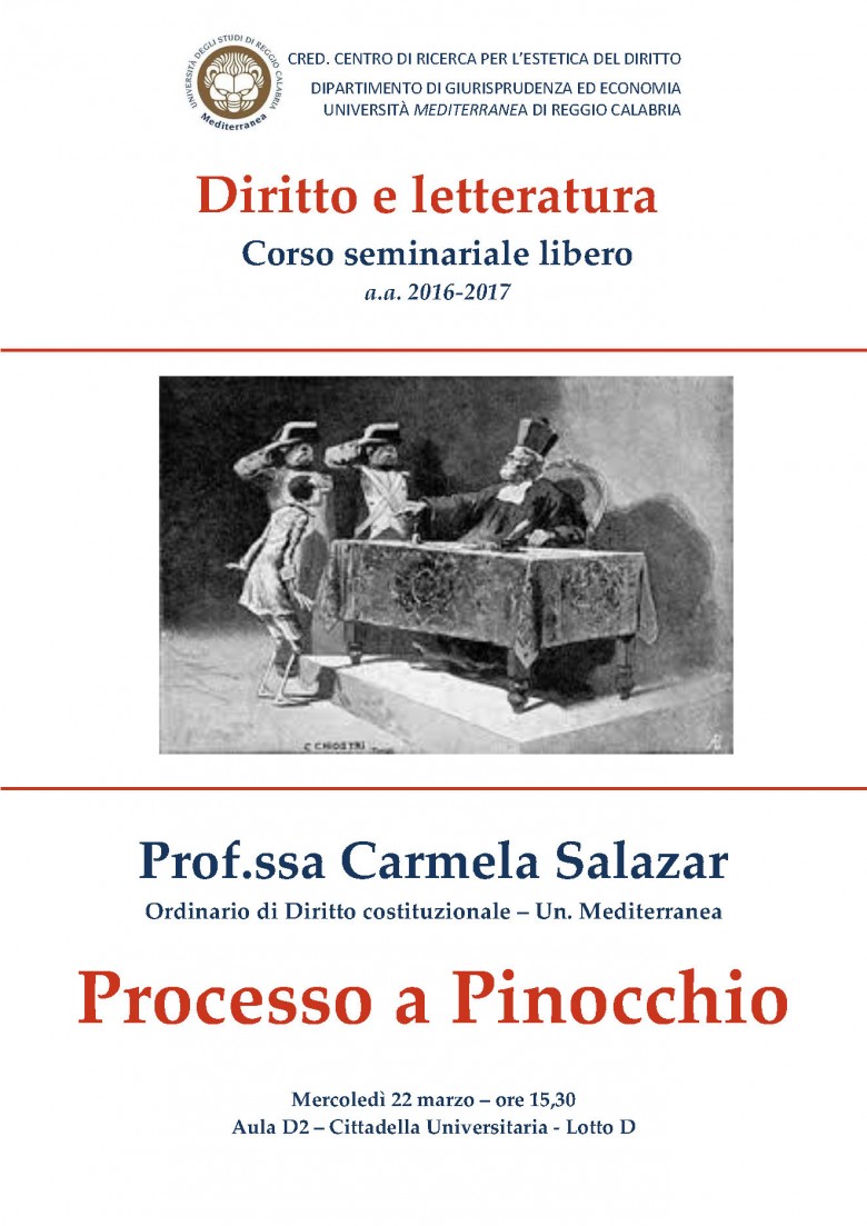 Nell'ambito del Corso di Diritto e letteratura organizzato dal CRED (Centro di ricerca per l'estetica del diritto - DiGiEc), la prof.ssa Carmela Salazar terrà la lezione dal titolo Il processo a Pinocchio, aula D2 - Lotto D, mercoledì 22 marzo, ore 15.30.