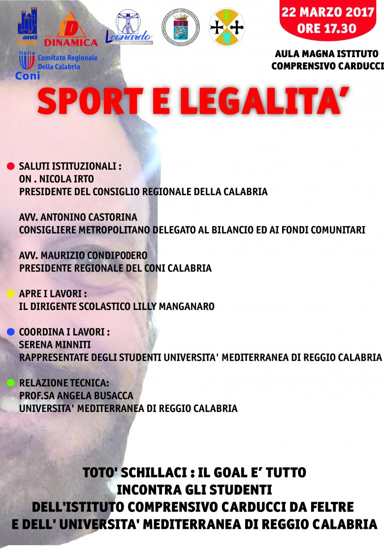 L'associazione studentesca Universitaria Leonardo il 22 marzo, di concerto con altre realtà associative e con la collaborazione del Comune di Reggio Calabria della Presidenza, del Consiglio Regionale della Calabria, dell' Anci Giovani ed il patrocinio morale del Coni Calabria rappresentato da Maurizio Condipodero, presenta alle ore 17.30 presso l'aula magna dell'istituto "Carducci - Da Feltre", ospiti del dirigente scolastico Lilly Manganaro, l'evento "Sport e legalità" alla presenza del bomber della nazionale Italiana Totò Schillaci.