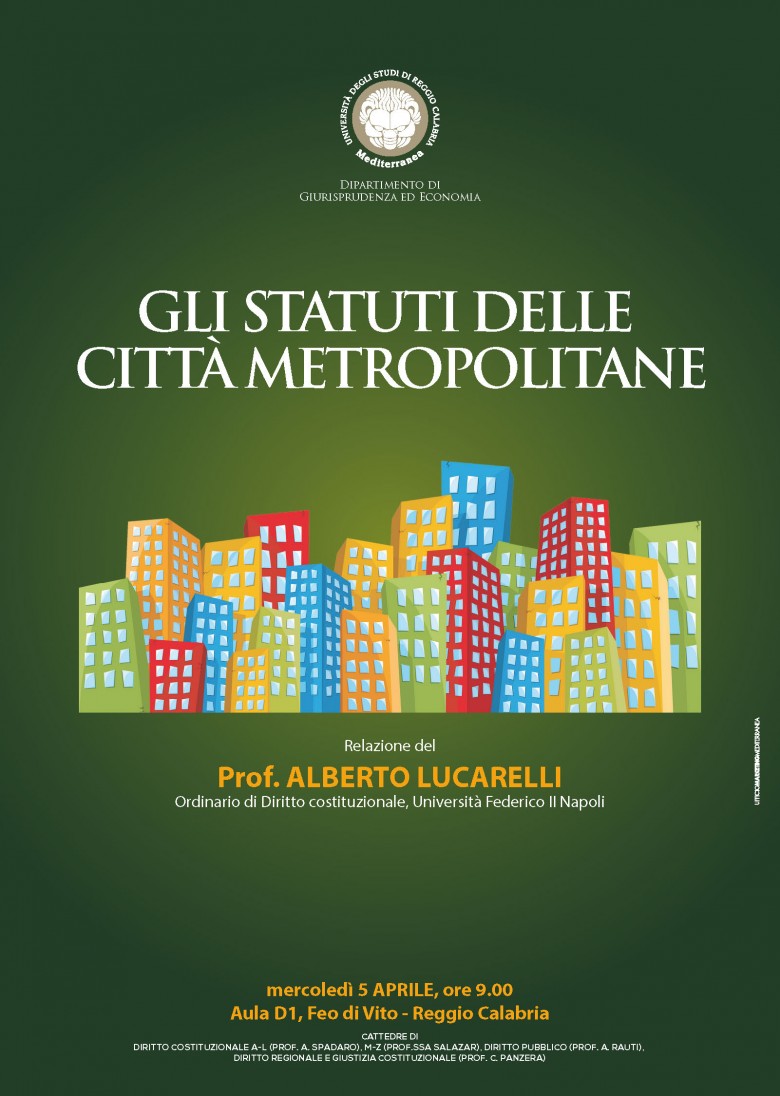 Il 5 aprile, alle ore 9.00, il prof. Alberto Lucarelli (ordinario di Diritto costituzionale, Università Federico II di Napoli) terrà una conferenza sul tema “Gli statuti delle città metropolitane” (Aula D1, lotto D), su iniziativa delle cattedre di Diritto costituzionale (proff. A. Spadaro e C. Salazar), Diritto pubblico (prof. A. Rauti), Diritto regionale e Giustizia costituzionale (prof. C. Panzera).