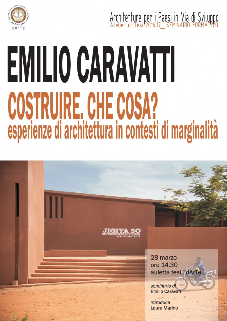 Nell’ambito delle attività dell’Atelier di Tesi “Architettura per i paesi in via di sviluppo”, attivato dal Dipartimento dArTe, il giorno 28 marzo alle ore 14,30 (auletta tesi) si svolgerà il 4° seminario a cura dell’arch. Emilio Caravatti dal titolo “COSTRUIRE CHE COSA? Esperienze di architettura in contesti di marginalità”.