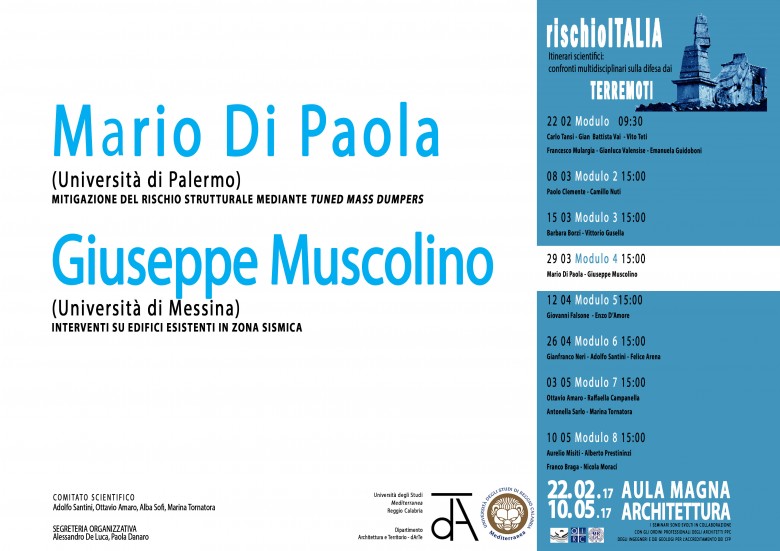 Il ciclo di seminari "Rischio Italia", organizzato dal Dipartimento DArTe del nostro Ateneo, si inquadra in questo contesto e vuole promuovere un dibattito multidisciplinare sul tema del rischio e della prevenzione. I seminari, rivolti a professionisti e studenti, saranno tenuti da alcuni tra i maggiori esperti italiani del settore e hanno lo scopo di contribuire a formare una consapevole e condivisa coscienza del pericolo e del conseguente rischio, mostrando che, pur nella loro ineluttabilità, dai terremoti ci si può e ci si deve difendere.