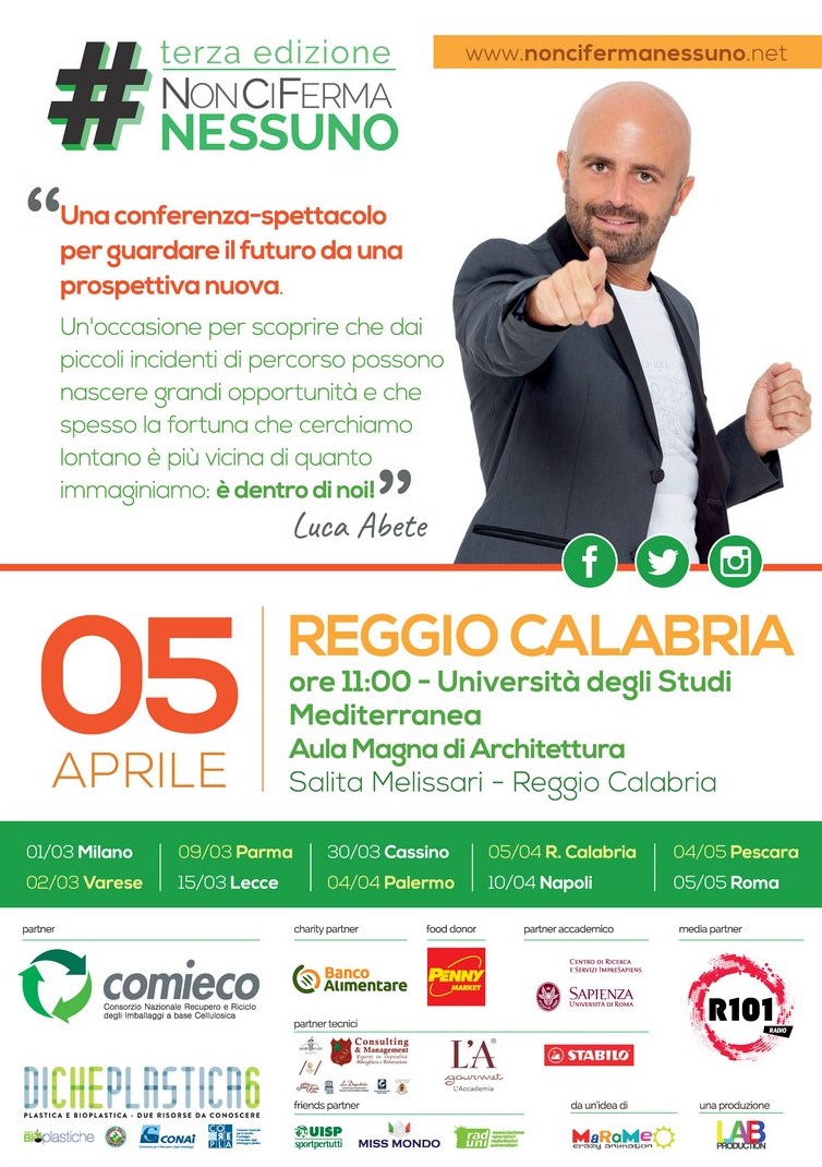 La carovana dell’ottimismo al grido di #NonCiFermaNessuno dopo Milano, Varese, Parma, Cassino e Palermo arriva a Reggio Calabria per la sesta tappa della terza edizione del tour motivazionale ideato da Luca Abete.