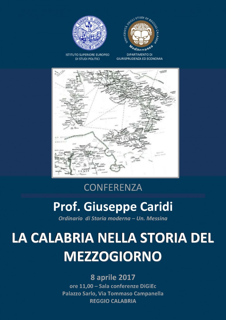 Il Corso 2016-2017 della 'Scuola di cultura politica' prosegue con la conferenza del prof. Giuseppe Caridi (ordinario di Storia moderna nell'Università di Messina) dal titolo 'La Calabria nella storia del Mezzogiorno' che si terrà sabato 8 aprile alle ore 11,00 presso la sala conferenze del DiGiEc a Palazzo Sarlo.