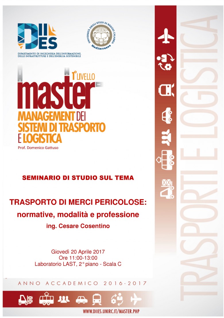 Giovedì 20 aprile, dalle 11:00 alle 13:00, presso il Laboratorio LAST del dipartimento DIIES, l’ing. Cesare Cosentino terrà un seminario sul tema “TRASPORTO DI MERCI PERICOLOSE: normative, modalità e professione”, nell’ambito del Master in Management dei sistemi di trasporto e logistica.