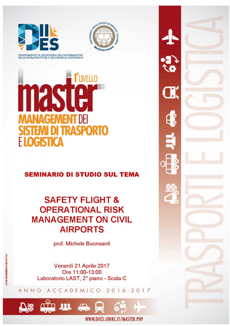 Venerdì 21 aprile dalle 11:00 alle 13:00 presso il Laboratorio LAST del dipartimento DIIES, nell’ambito del Master in Management dei sistemi di trasporto e logistica, il prof. Michele Buonsanti terrà un seminario sul tema “Safety Flight & Operational Risk Management on Civil Airports”.