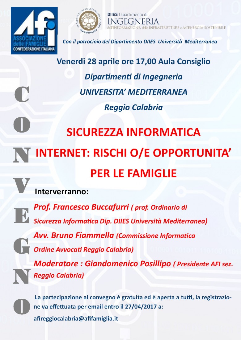 Il 28 aprile alle 17.00, presso l'Aula del Consiglio di Ingegneria si terrà il convegno Sicurezza informatica. Internet: rischi o/e opportunità per le famiglie.
