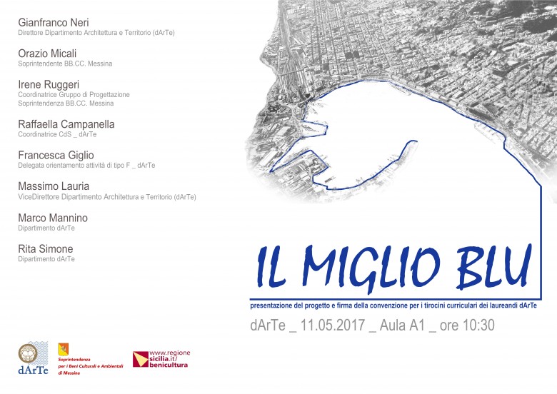 Giovedi 11 maggio alle 10,30, in aula A1 di Architettura si terrà la presentazione del progetto “Il Miglio Blu” finanziato nell'ambito del Patto per la Sicilia. In tale occasione il Soprintendente ai Beni Culturali di Messina, arch Orazio Micali, descriverà il programma coordinato d’interventi per la Città di Messina che, seguendo la linea di costa ed il fronte marittimo, misura l’ampio tratto urbano che unisce il forte SS.Salvatore all'area dell'ex ospedale R. Margherita.