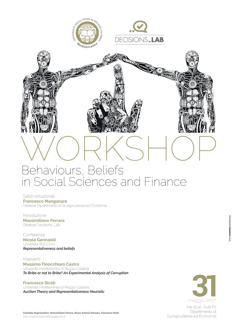 Il Laboratorio Decisions_LAB nell’ambito della sua attività di ricerca promuove l’organizzazione di un momento di approfondimento scientifico dedicato all’Economia Comportamentale. Al Workshop dal titolo “Behaviours, Beliefs in Social Sciences and Finance” interverrà nella qualità di main speaker uno dei suoi massimi studiosi a livello internazionale: il professore Nicola Gennaioli della Università Bocconi di Milano. Seguiranno due interventi programmati a cura del prof. Massimo Finocchiaro Castro e del dott. Francesco Strati.