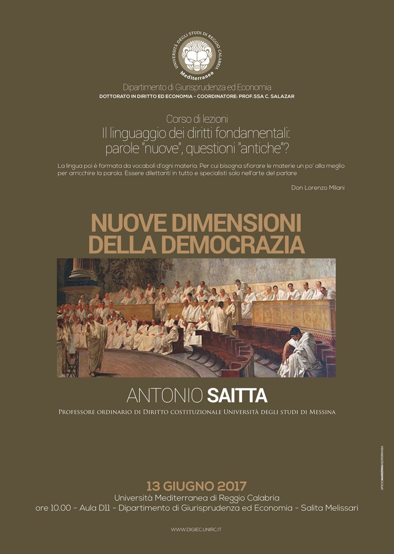 Nel quadro del corso di lezioni per i dottorandi in Diritto ed Economia, "Il linguaggio dei diritti fondamentali. Parole "nuove", questioni "antiche"?, il prof. Antonio Saitta, ordinario di Diritto costituzionale nell'Università di Messina, relazionerà sul tema "Nuove dimensioni della democrazia".