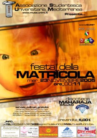 Nell'occasione del 5° compleanno dell'Associazione, mercoledì 23 novembre presso la discoteca Maharaja di Gallico (RC) si terrà Festa della Matricola 2005" Visita il sito della MUSA per ulteriori informazioni.