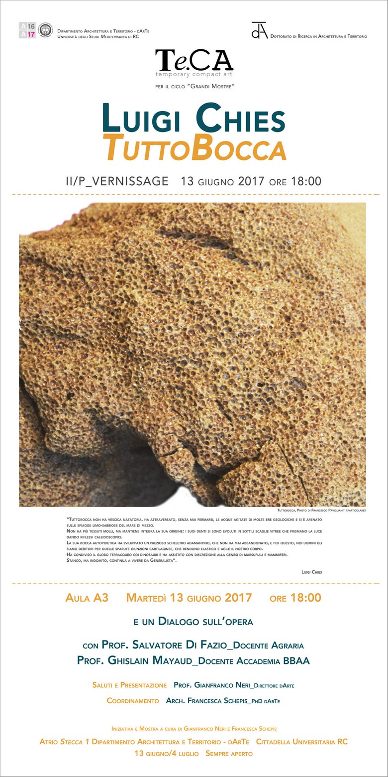 Dopo la Presentazione si terrà il Vernissage dell’opera TuttoBocca per la galleria d’arte contemporanea Te.CA_Temporary Compact Art presso l’Atrio della Stecca 1 del dArte_Dipartimento Architettura e Territorio.