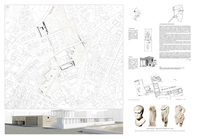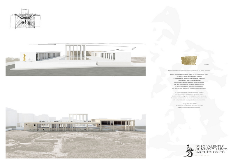 L’area archeologica di Vibo Valentia si trova nel cuore della città. Frammento superstite alla pressione urbanistica era, al tempo della città romana di Valentia il luogo dove sorgevano le domus. Dagli scavi ne riemergono i tracciati murari e alcuni pavimenti decorati a mosaico. Il progetto tende a organizzare e valorizzare una nuova idea di parco archeologico, scegliendo come tema quello del foro romano. Ad esso vi si accede mediante due piazze, messe in collegamento. Quella che ospita l’antiquarium riqualifica il vuoto urbano a nord oggi adoperato da ambulanti venditori, creando uno spazio che ha per fulcro le attività sociali e funzionali al parco, mentre sotto terra “nasconde” una vera e propria struttura museale contenente quanto sarà messo alla luce con gli scavi. I rinvenimenti archeologici sono protetti da coperture che danno modo di poter finalmente disseppellire i grandi tesori del sottosuolo, con un sistema modulare e durevole, concepito come un elemento poggiato e assumendo come prassi progettuale la logica della tutela.