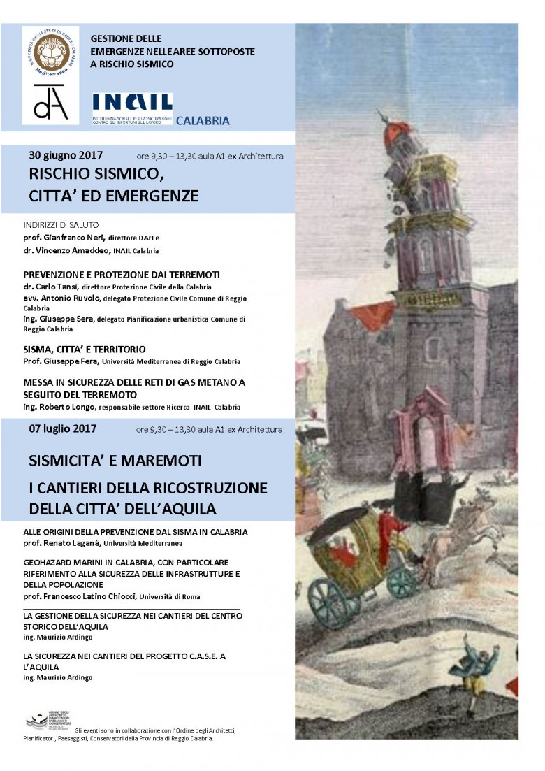Due appuntamenti sulla Gestione delle emergenze nelle aree sottoposte a rischio sismico. Il primo il 30 giugno, presso l'aula A1 di Architettura sul tema Rischio sismico, Città ed Emergenze. Il secondo, sempre nell'aula A1 di Architettura, sarà tenuto il 7 luglio su Sismicità e maremoti. I cantieri della ricostruzione della città dell'Aquila. Entrambi con inizio alle ore 9.30.