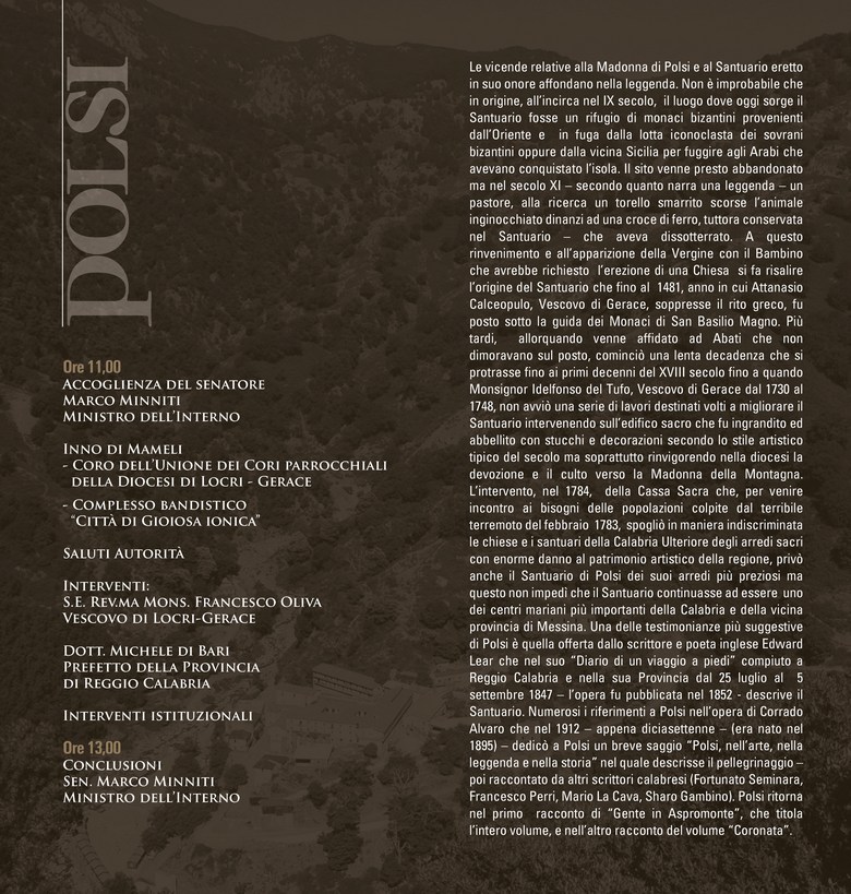 3 luglio Santuario di Polsi: la simbologia nel rapporto tra sacro e legalità, con Marco Minniti