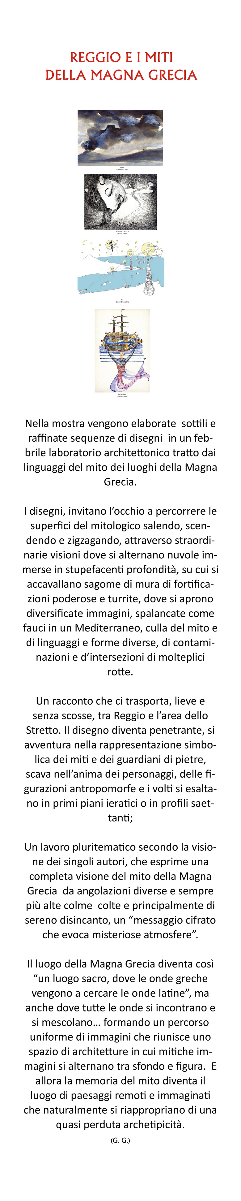 L’esposizione, inaugurata con il reading dall’attrice romana Annalisa Cordone, raccoglie schizzi, disegni, acquerelli, incisioni dei docenti dell’Università Mediterranea: Ottavio Amaro, Gianni Brandolino, Gaetano Ginex e Gianfranco Neri che, con la loro originale interpretazione, hanno rappresentato paesaggi, luoghi e miti dello Stretto e dell’antica Magna Grecia. L’allestimento degli spazi è arricchito dalle opere scultoree, pittoriche e fotografiche di Alessandro Allegra, Gabriele Varaldo e Antonello Diano.
