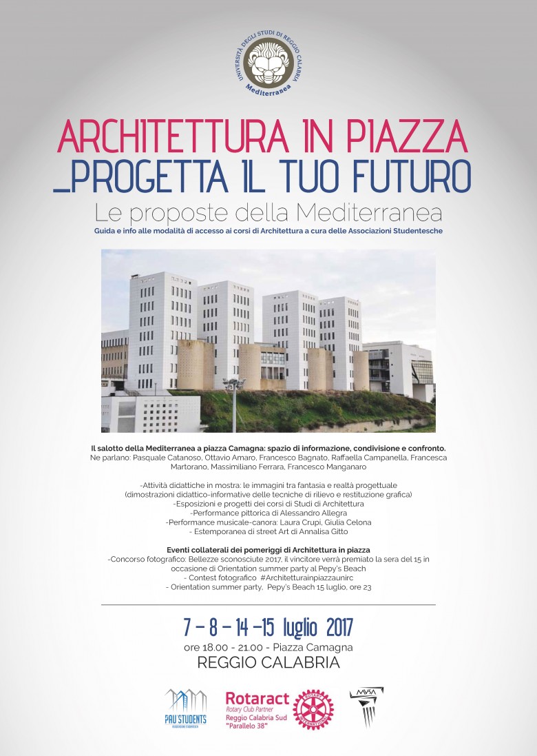 L’Università Mediterranea di Reggio Calabria, con i suoi due Dipartimenti di area Architettura, PAU e dArTe, presenta Architettura in piazza _ Progetta il tuo futuro - Le proposte della Mediterranea: guida e info alle modalità di accesso ai corsi di Architettura a cura delle Associazioni Studentesche.